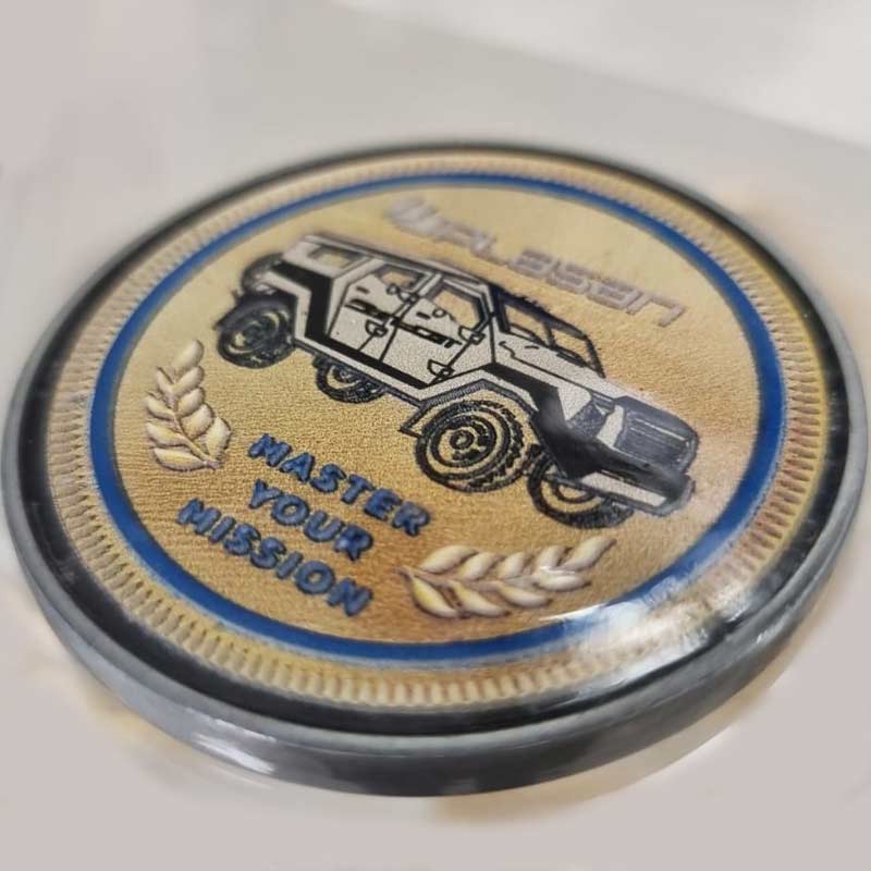 מדליה ממתכת יצוקה עם הדפסה צבעונית תלת־ממדית, בעיצוב אישי לפי דרישת הלקוח.