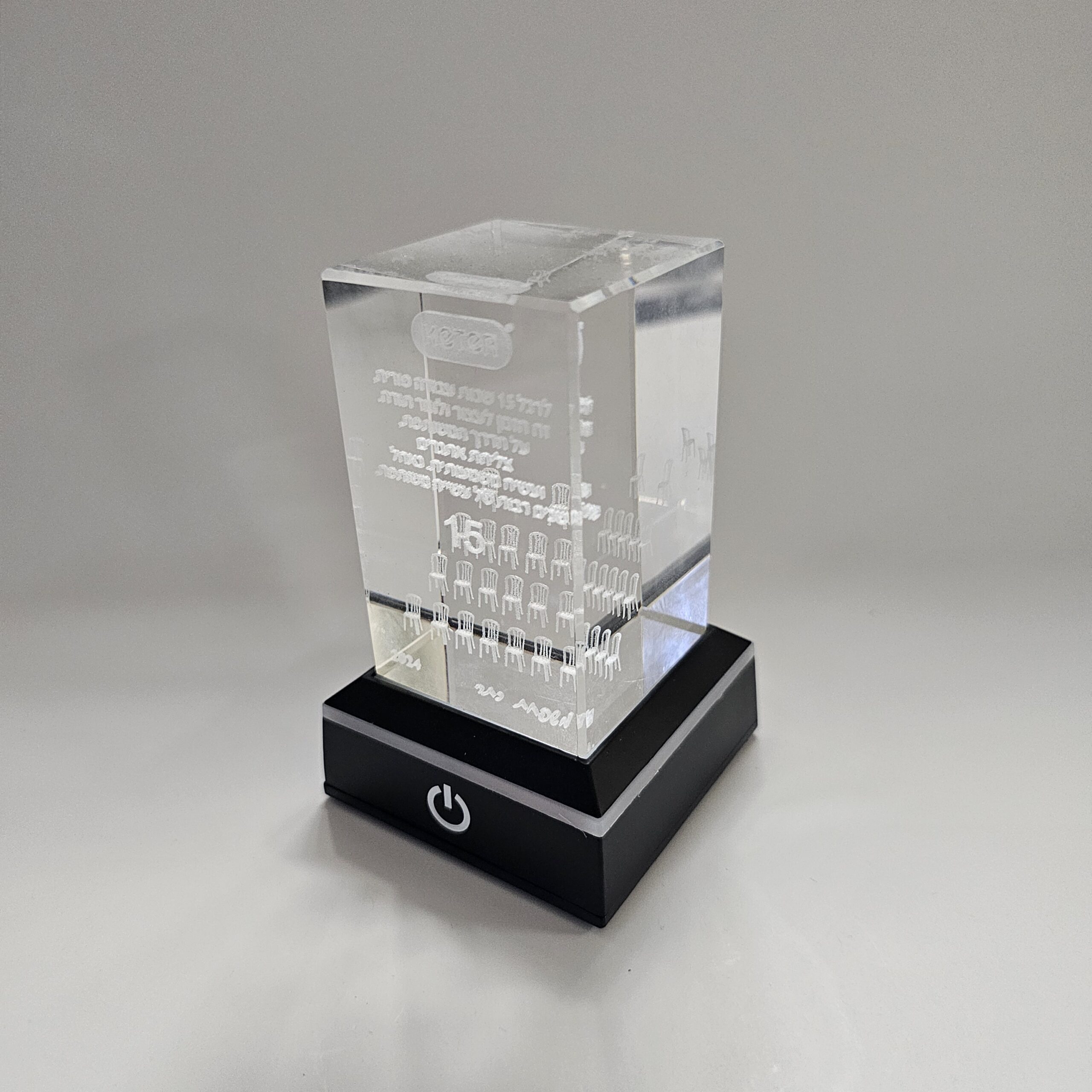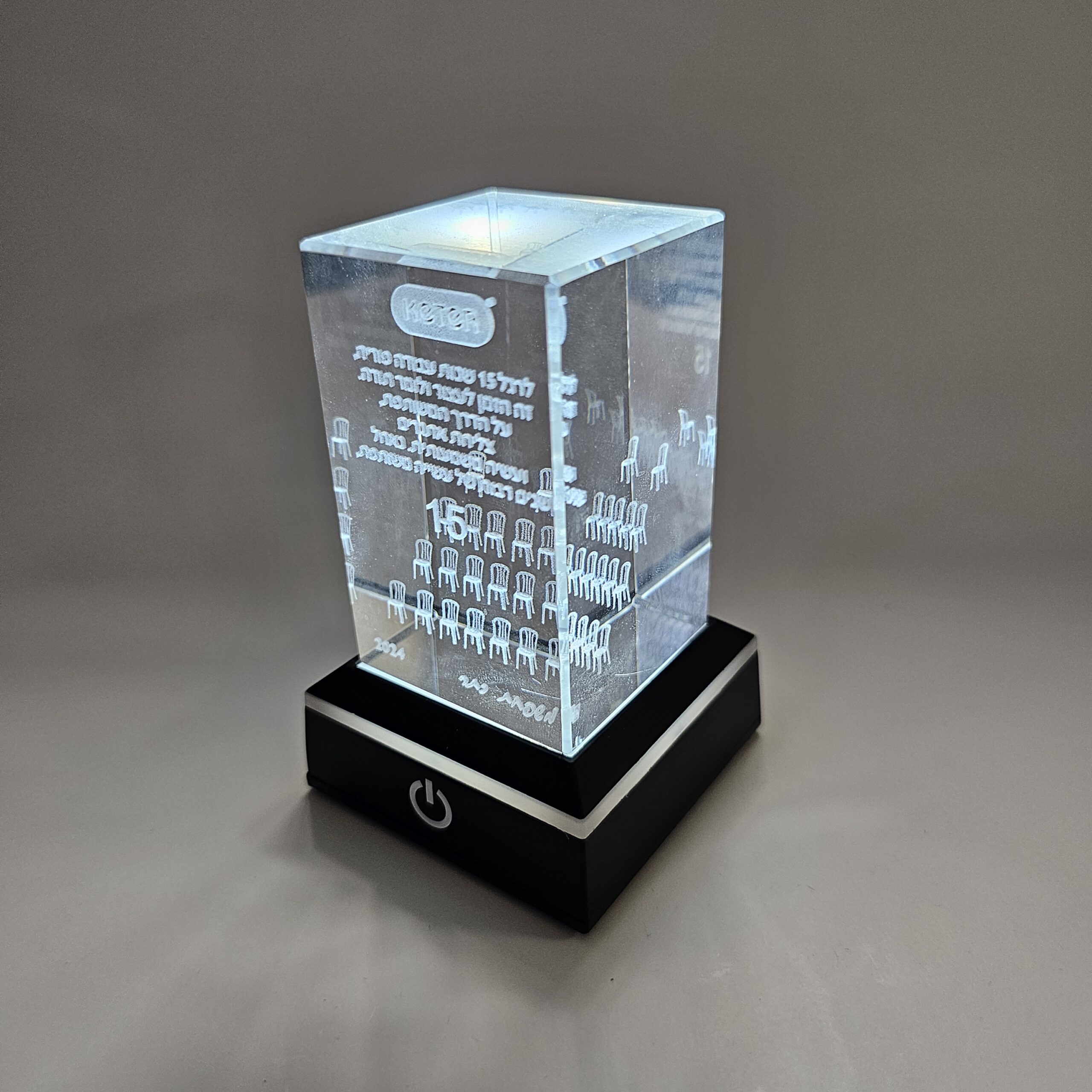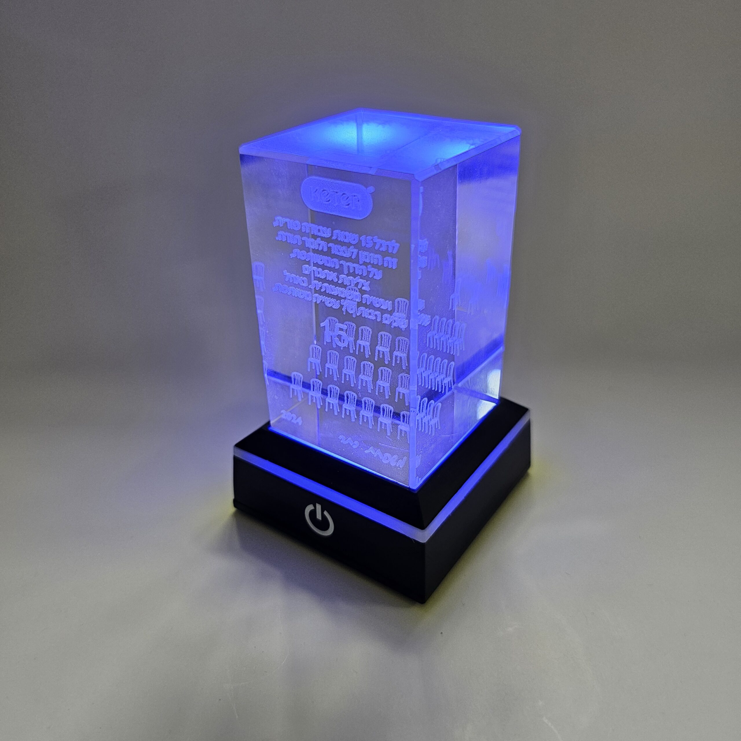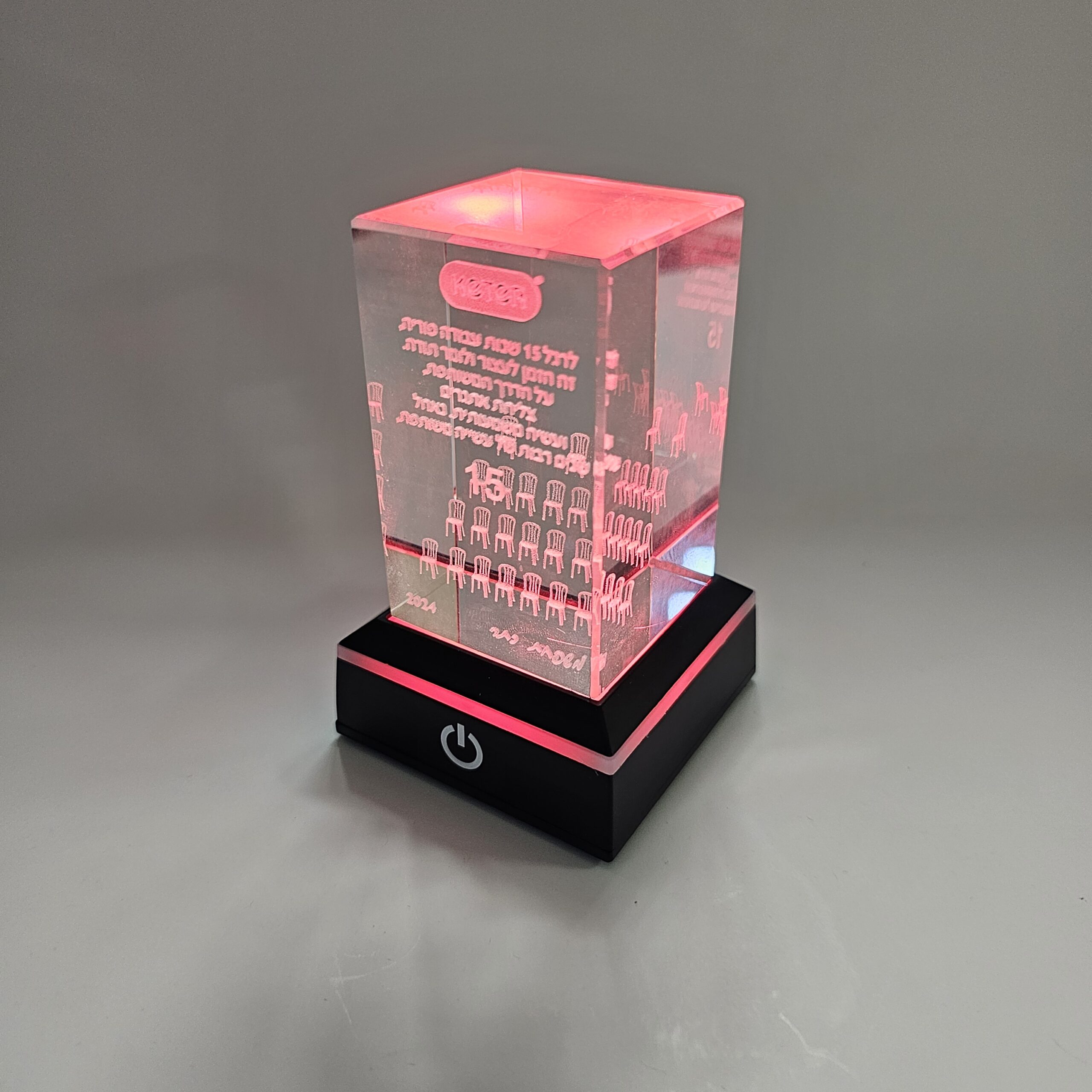 מעמד תאורה יוקרתי שמבליט מאד את צריבת הלייזר הפנימית.