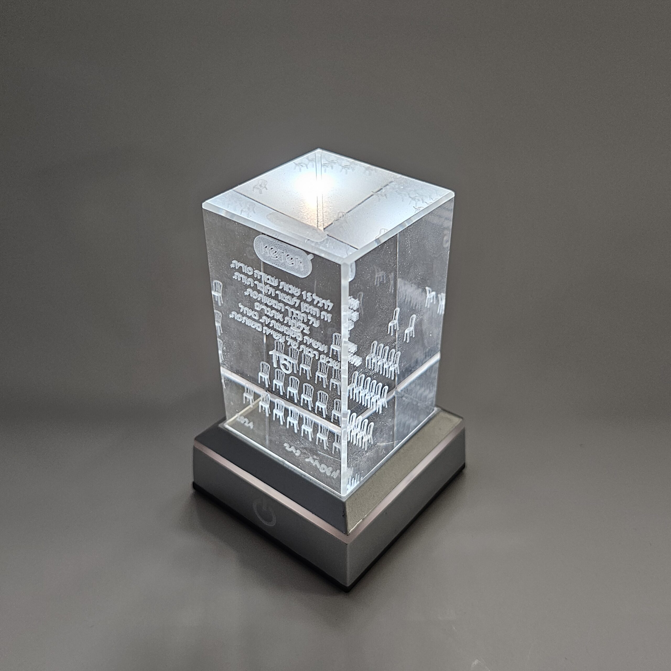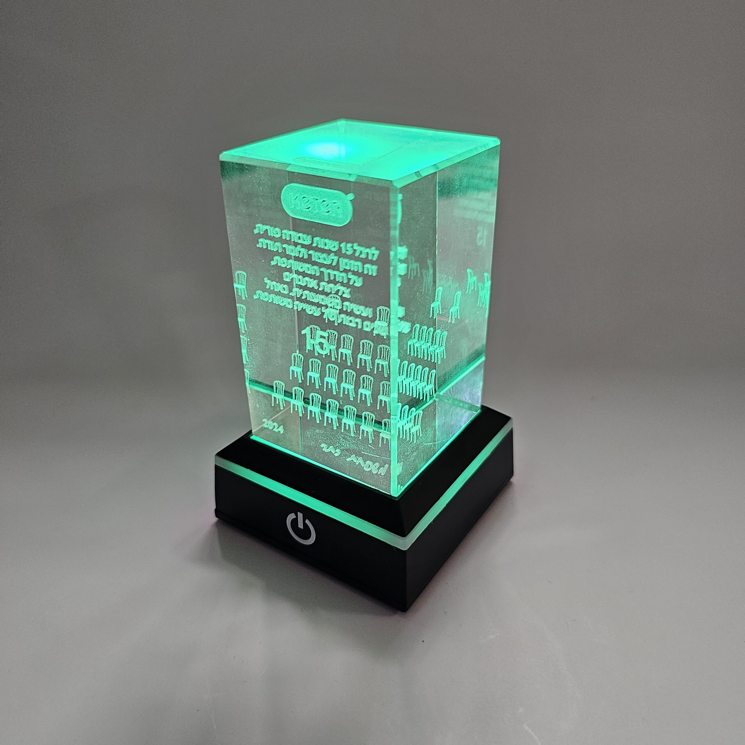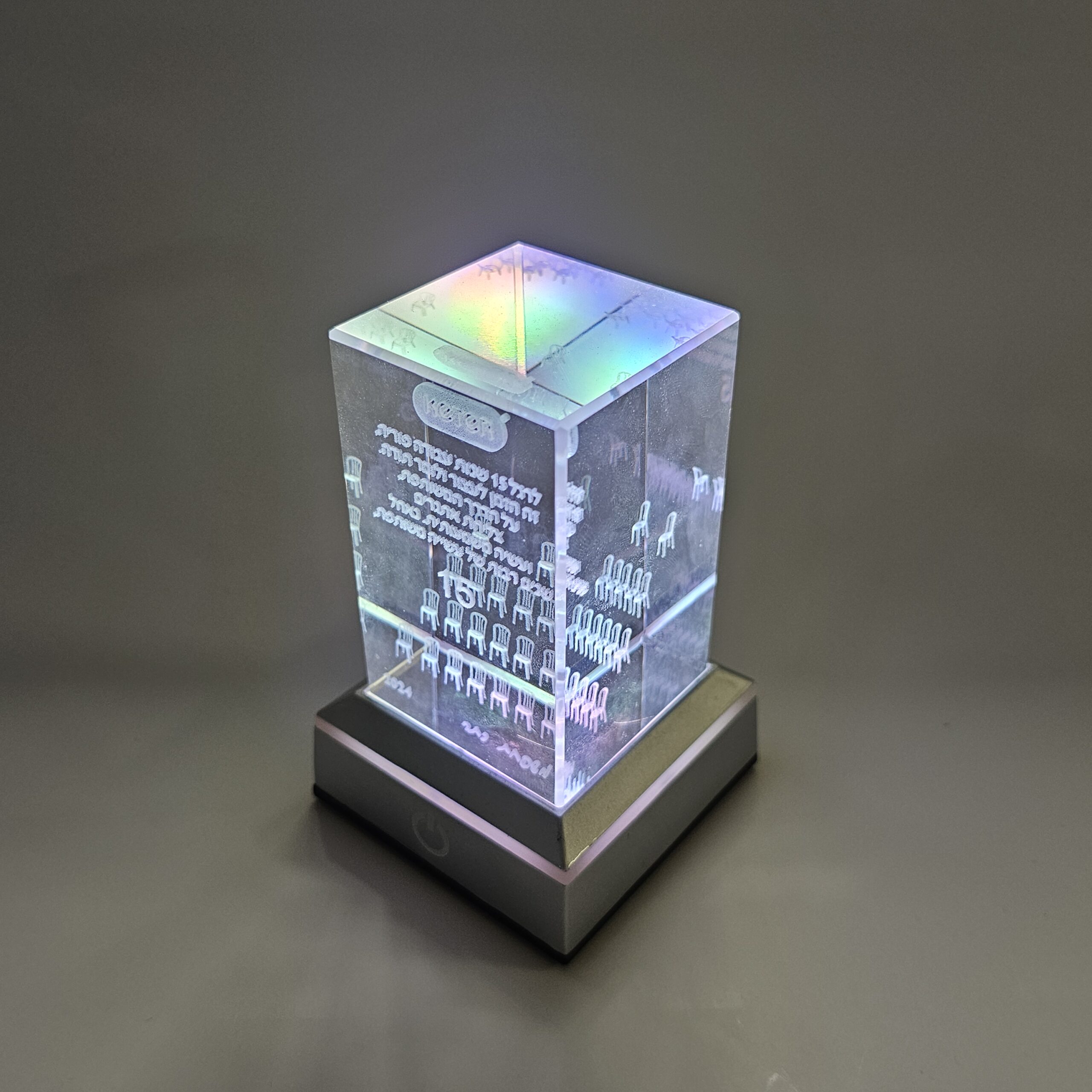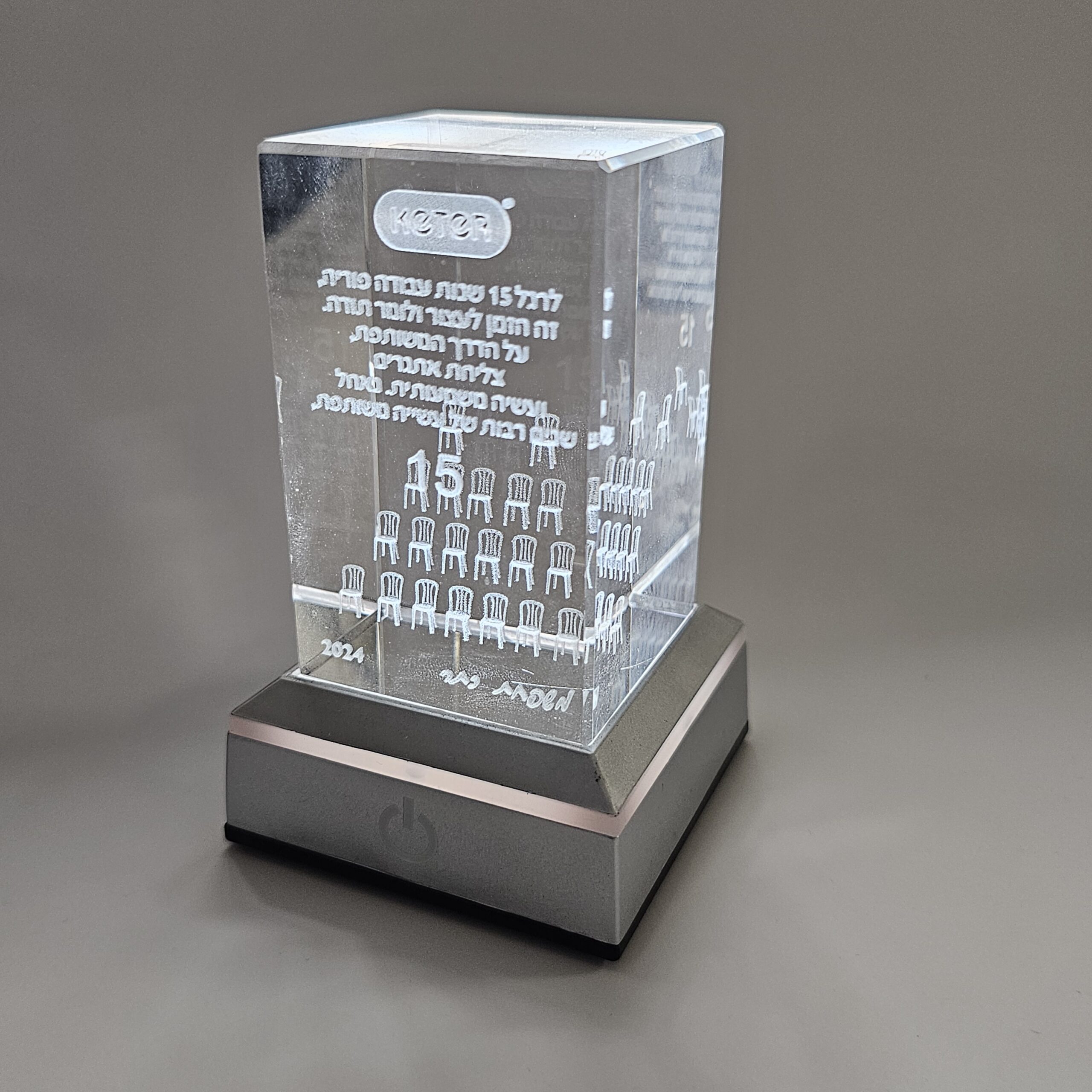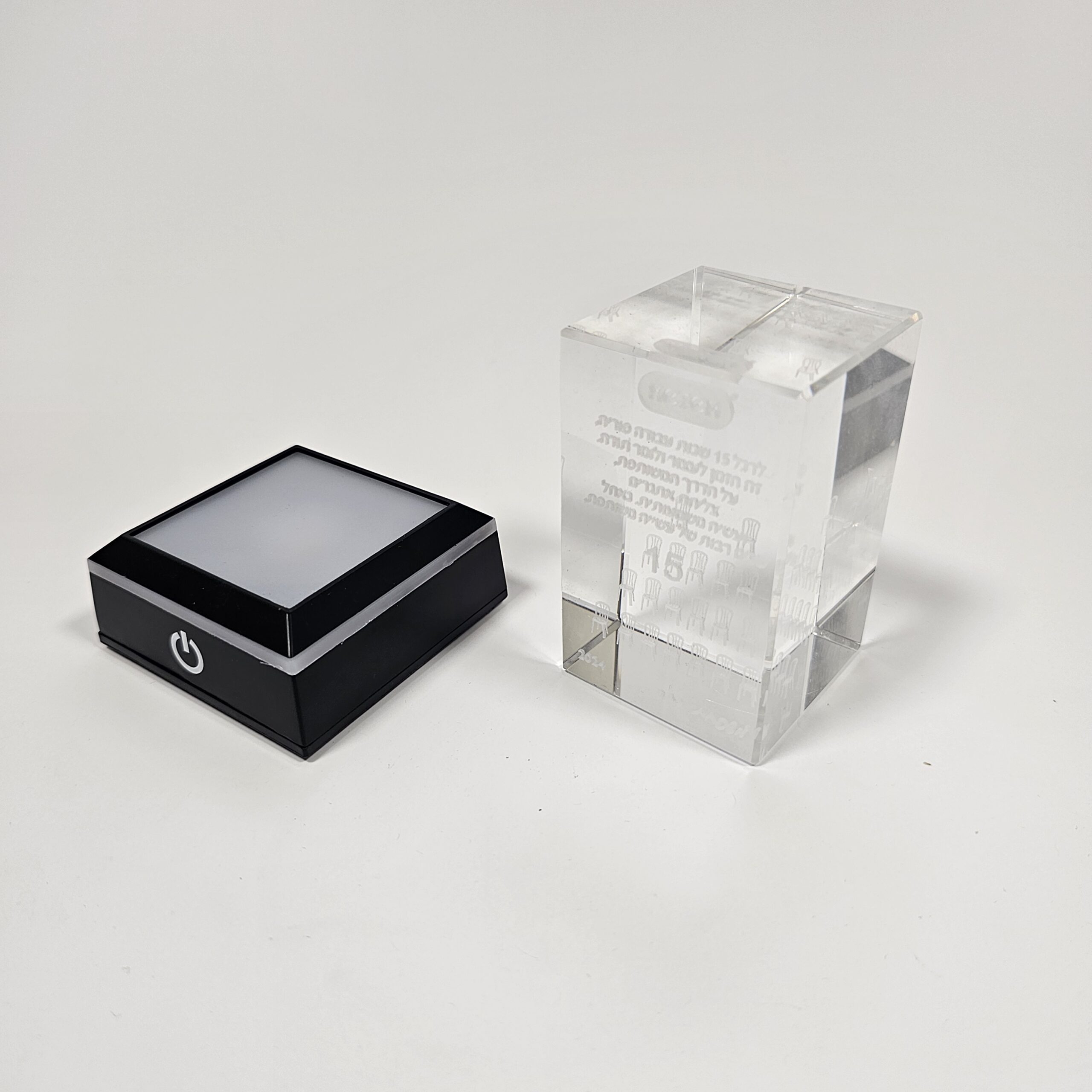 מעמד תאורה יוקרתי שמבליט מאד את צריבת הלייזר הפנימית.