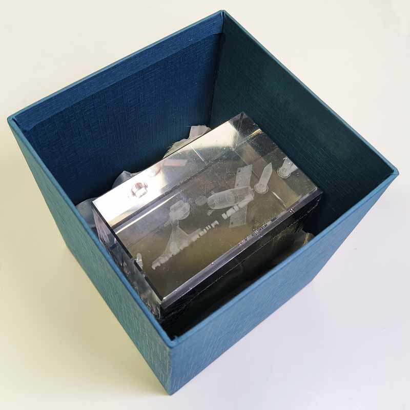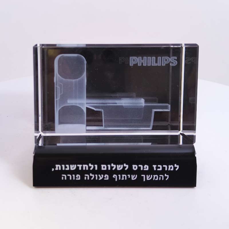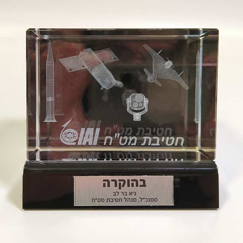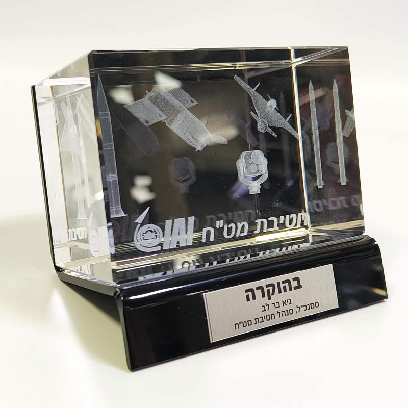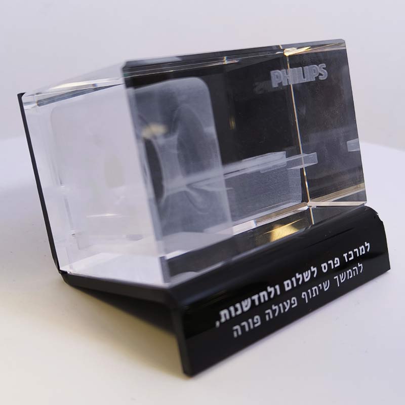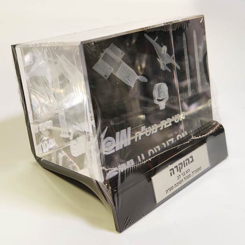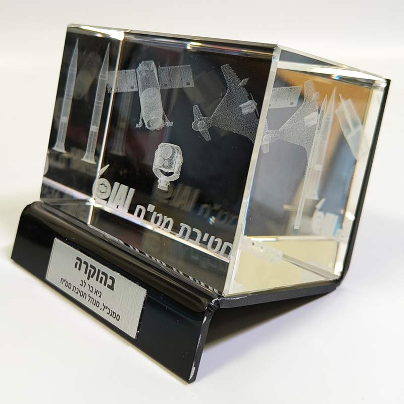 קריסטל איכותי עם חריטה פנימית בלייזר תלת־ממד, בשילוב בסיס פרספקס מוקפד, שמעניק למוצר מראה מודרני, מרחף ויוקרתי במיוחד.