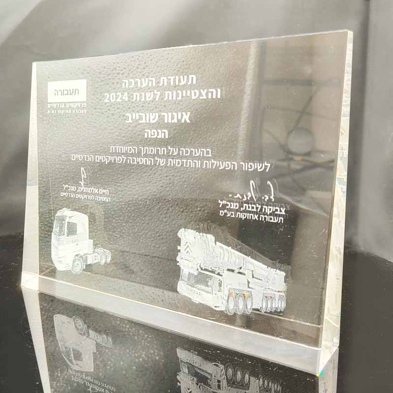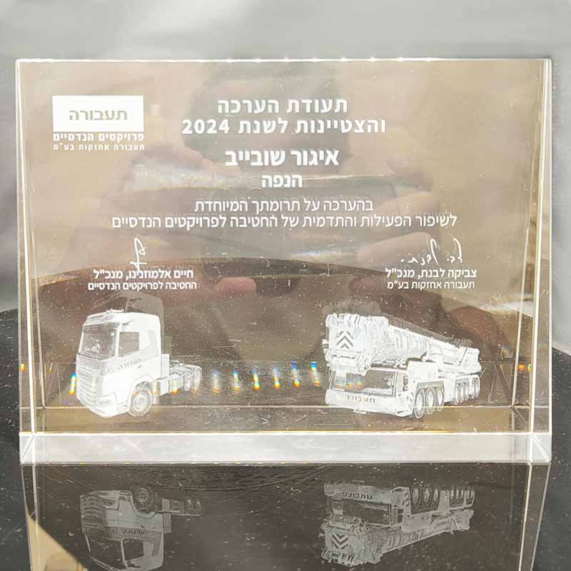בלב הקריסטל מתבצעת חריטה תלת־ממדית בטכנולוגיית לייזר מתקדמת – עם טקסט, לוגו, תמונה או דיוקן – לבחירתכם.